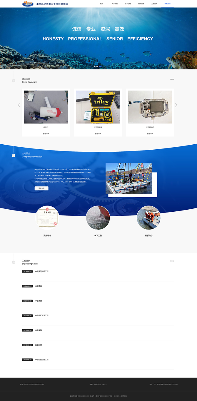 秦皇島兄弟潛水工程有限公司成立于2000年06月,由畢業(yè)于我國(guó)唯一的工程潛水學(xué)!獜V州潛水學(xué)校的盧銘臣等共同創(chuàng)立。公司位于環(huán)境優(yōu)美的海濱城市——秦皇島,是一家專(zhuān)門(mén)從事水下工程的專(zhuān)業(yè)公司。